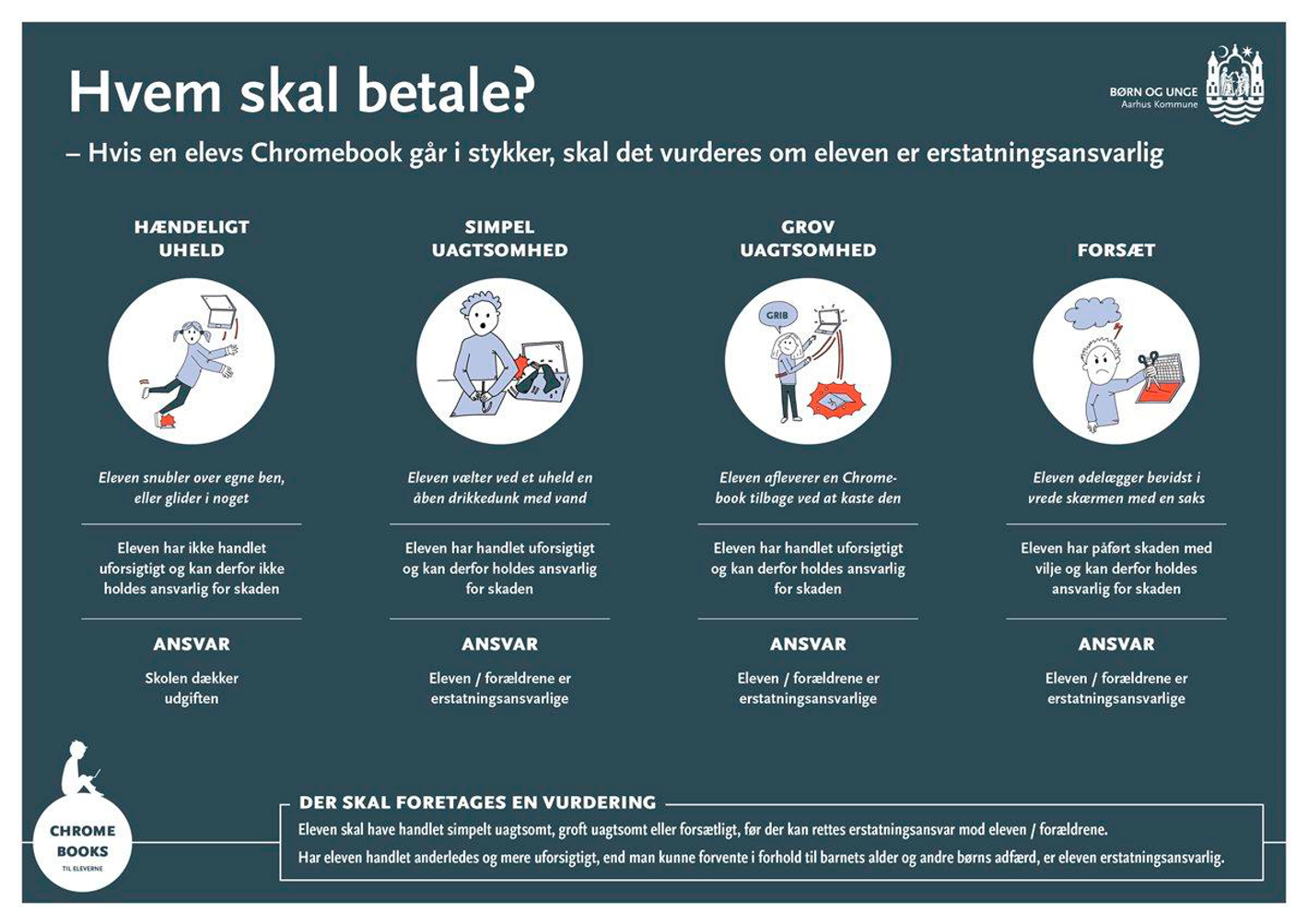 Hvis dit barn har en plausibel og overbevisende forklaring på, at en Chromebook er gået tabt på hændelig vis, bliver dit barn fritaget for ansvar og skal ikke betale. Hvis dit barn ikke har handlet efter de instruktioner, som skolen har givet, så har dit barn handlet ansvarspådragende, og det er dit barn eller dig som forælder, der har ansvaret. Erstatningskravet vil ikke kunne være højere end den enkelte Chromebooks værdi. Den kan evt. være dækket af din indboforsikring og vilkårene herfor. Det er en privat beslutning, hvilken forsikring, du som forælder har valgt at tegne, og om du ønsker at involvere dit forsikringsselskab i en eventuel anmeldelsessag. Skolen og Aarhus Kommune kan ikke give anbefalinger eller vejledning om private forsikringsforhold.